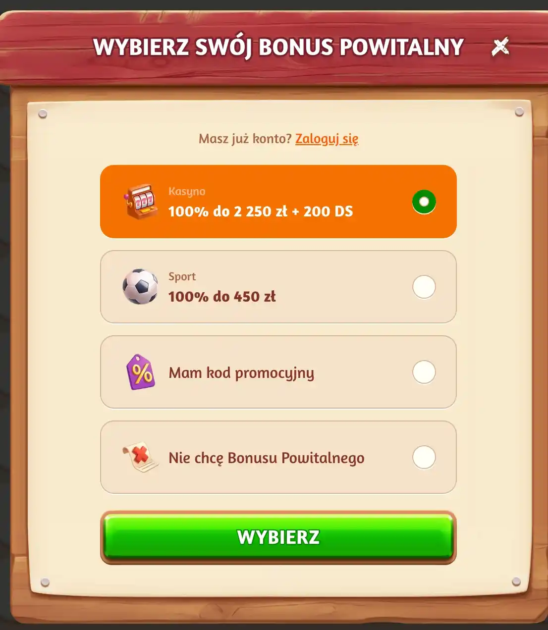 - Po kliknięciu przycisku będziesz mógł wybrać swój bonus powitalny. Strona udostępnia ofertę do kasyna, jak i na zakłady sportowe. Alternatywnie możesz też podać kod promocyjny lub zrezygnować z odbierania promocji na start.