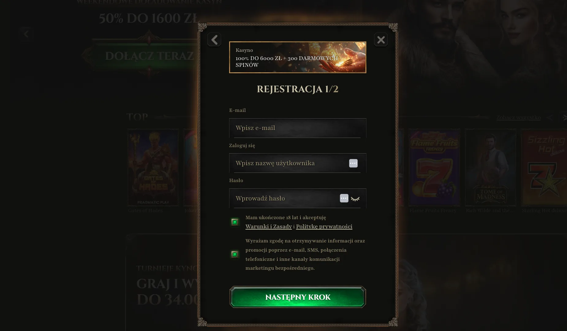 - Wybierz bonus powitalny, wpisz kod promocyjny lub zrezygnuj z udziału w promocji. Na start platforma ma dla ciebie 100% do 6000 zł i 300 darmowych obrotów do wykorzystania w kasynie albo 100% do 2000 zł na zakłady sportowe.