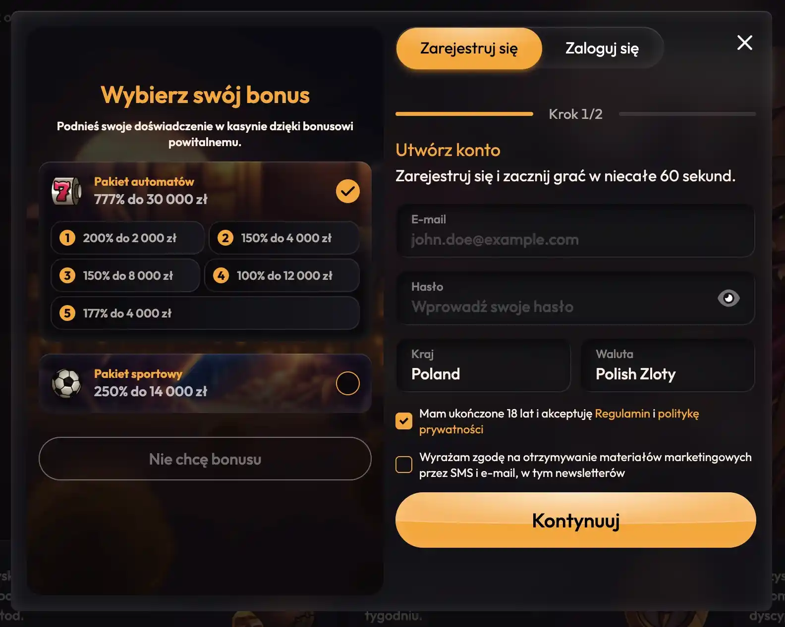 - Wejdź na oficjalną stronę kasyna i kliknij “Zarejestruj się” w prawym górnym rogu.