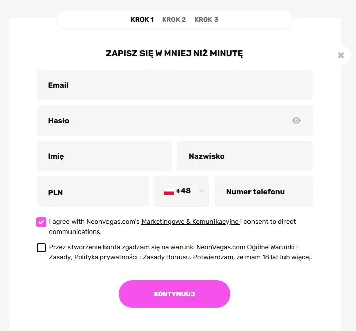 Neon Vegas jest kasynem przyjaznym dla graczy, począwszy już od rejestracji. Zakładanie konta zostało uproszczone do dosłownie kilku kroków. Oto, co należy zrobić, aby założyć konto w tym kasynie: