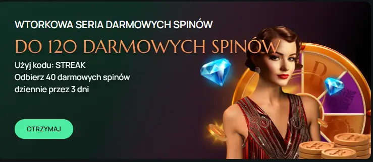 Z promocji skorzystać można po aktywacji kodu bonusowego STREAK. Z oferty skorzystać można w każdy wtorek, wpłacając przynajmniej 100 złotych. W ramach tego bonusu będziesz otrzymywać po 40 spinów przez 3 dni – a zatem łącznie otrzymasz 120 zakręceń za tylko 100 PLN! Promocja działa w każdy wtorek – dostępna jest jednak wyłącznie do pierwszej wpłaty w ten dzień.