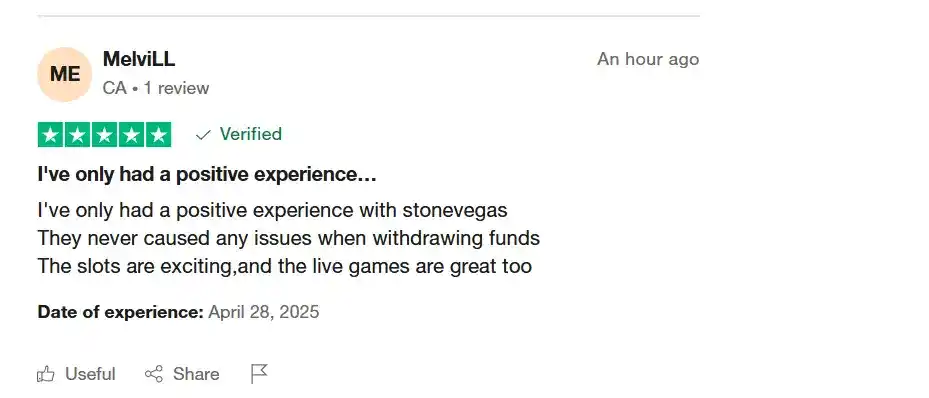 Na Trustpilot StoneVegas buduje solidną reputację. Choć platforma działa dopiero od niedawna, większość recenzji użytkowników wskazuje na dobre doświadczenia z płatnościami, wysoką jakość obsługi klienta oraz przejrzyste zasady bonusowe. Klienci chwalą także szybkie wypłaty i profesjonalne podejście supportu do rozwiązywania problemów. Poniżej przykłady komentarzy: