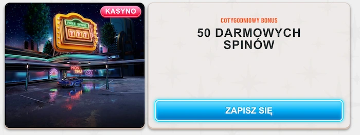 Kolejna oferta strony to specjalny bonus cotygodniowy, z którego skorzystać mogą już wszyscy gracze. By odebrać promocję, należy wpłacić 90 złotych w tygodniu, między poniedziałkiem a czwartkiem. W ten sposób otrzymać można 50 darmowych spinów.