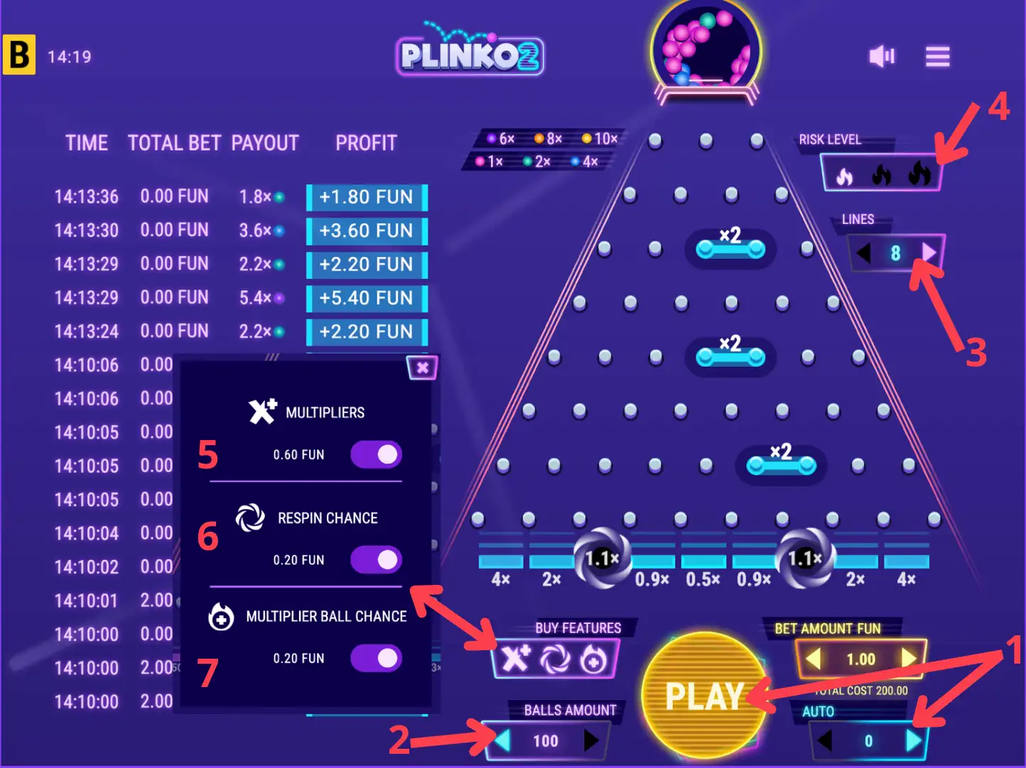 - Naciśnij „Graj” i obserwuj, jak kulka odbija się od kołków, lądując w komórce z mnożnikiem.